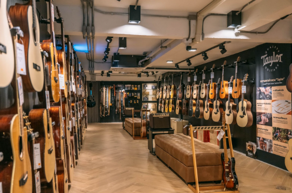 พื้นที่ภายในร้านถูกจัดวางอย่างโปร่งสบาย ทำให้คุณเดินเลือกเครื่องดนตรีหรือทดลองเล่นได้อย่างอิสระตามใจชอบ